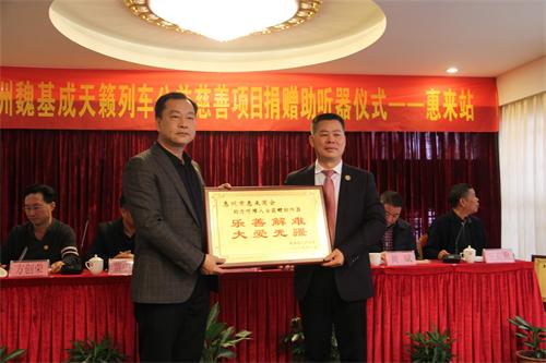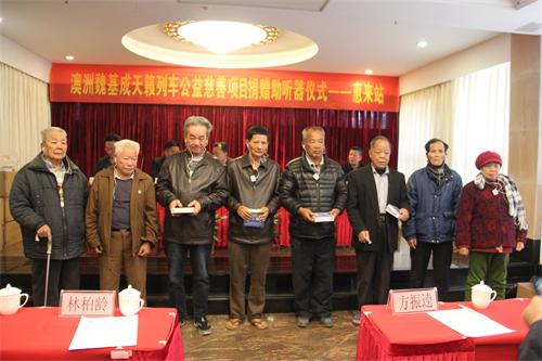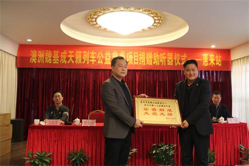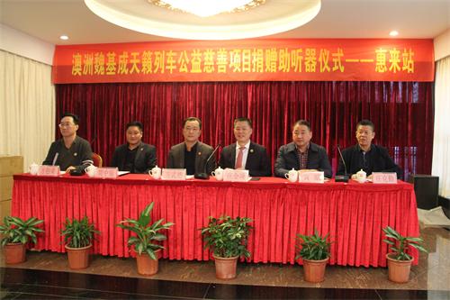 2019年1月4日,澳洲魏基成天籁列车驶进了广东揭阳市惠来站,为惠来县千名听障人士开展捐赠价值约500万的助听器活动。这次捐赠产品是新款充电式蓝牙助听器,由澳洲魏基成先生捐赠,惠州市惠来商会与惠州市惠豫公益服务中心携手接力开展的一次扶贫公益活动。